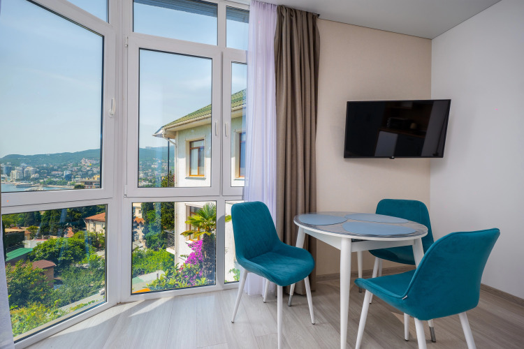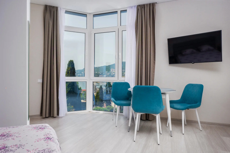 В номере есть кухня, телевизор, кондиционер, фен, гладильная доска, утюг, обеденный столик, кровать двуспальная.