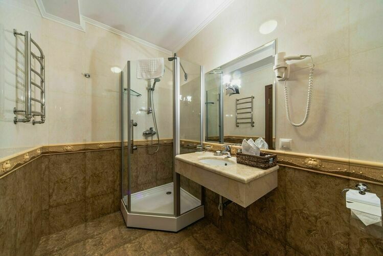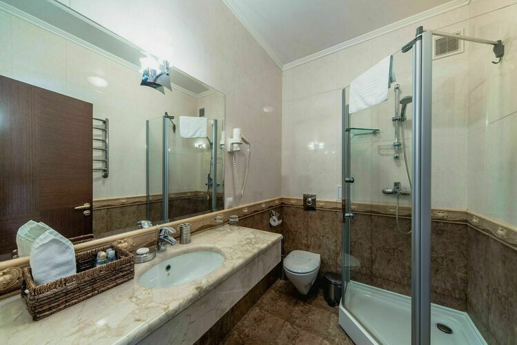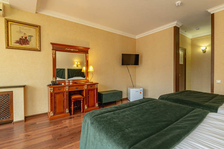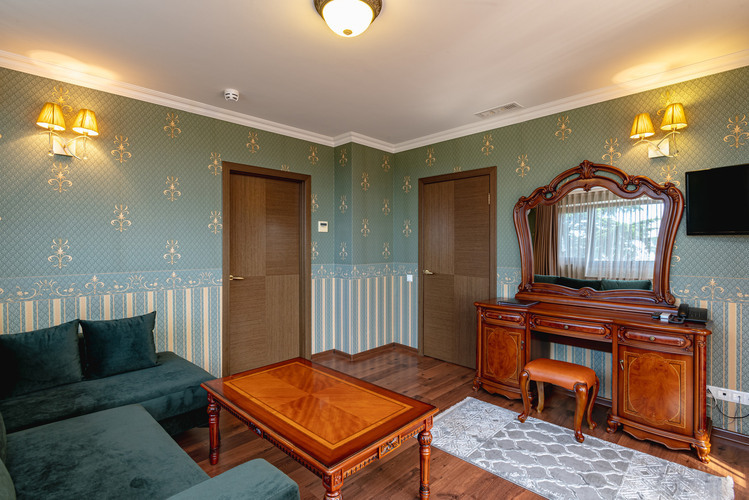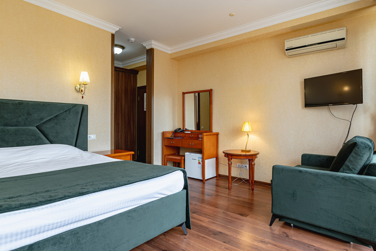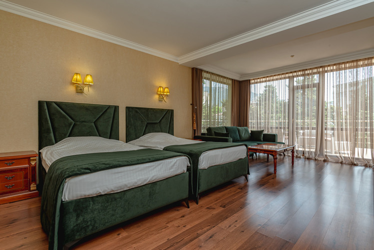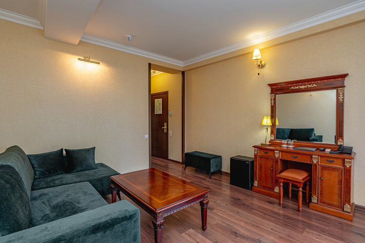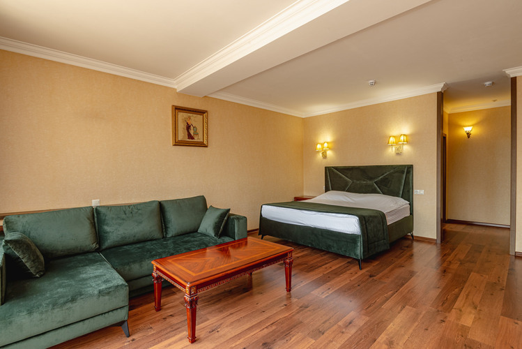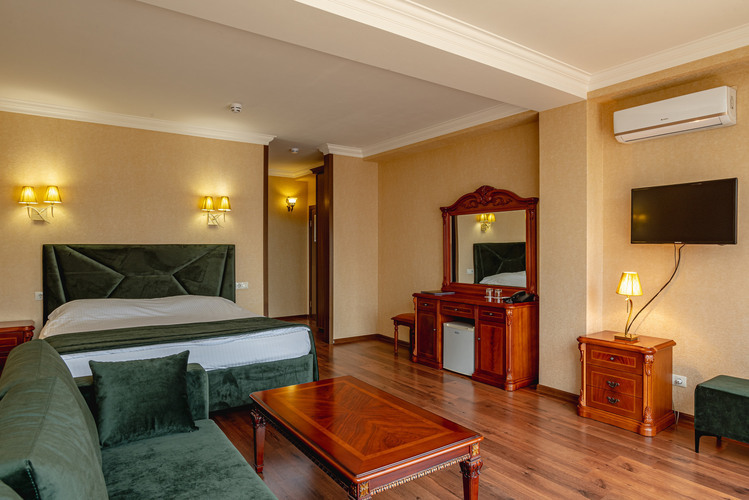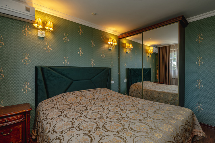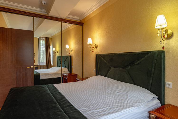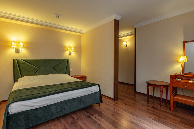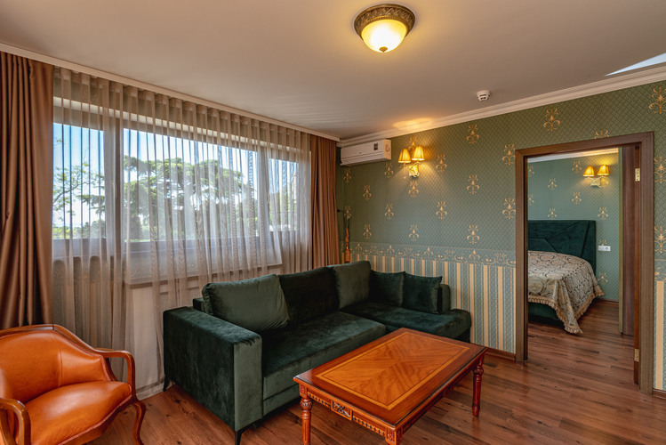 Роскошный двухкомнатный номер с выходом на балкон общей площадью 50 квадратных метров, с одной двуспальной кроватью и угловым двуспальным раскладным диваном для проживания дополнительного человека. В номере частного отеля «Бульвар» Вы можете воспользоваться мини-баром, сейфом, кондиционером, бесплатным Wi-Fi, феном, телефоном, LED-телевизором с цифровым телевидением. Так же имеются: фирменные халаты, одноразовые тапочки, набор полотенец на каждого гостя, минипарфюмерия.