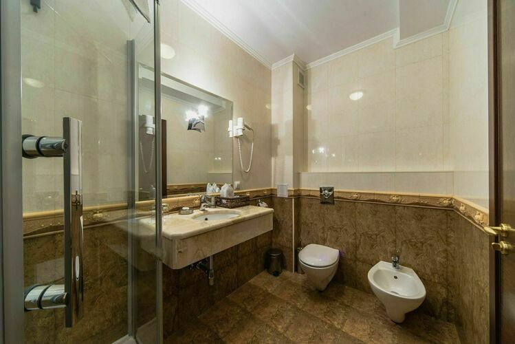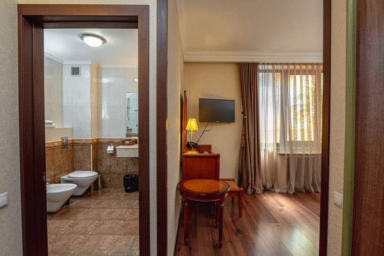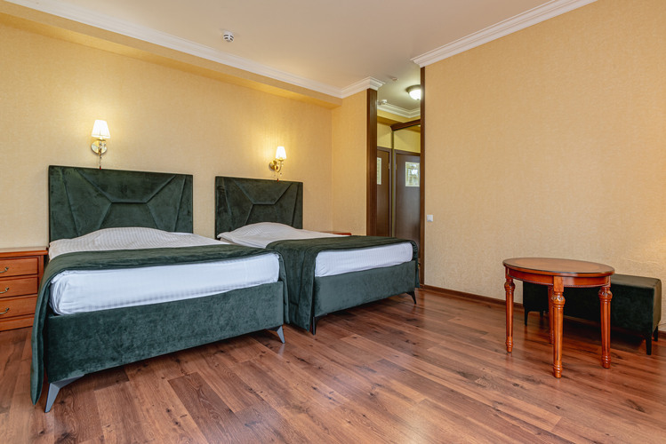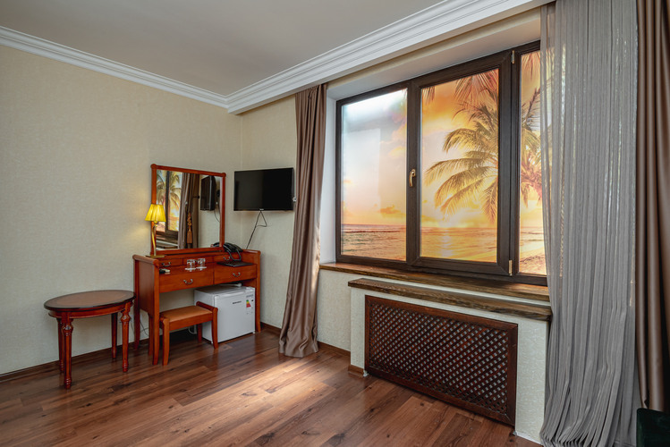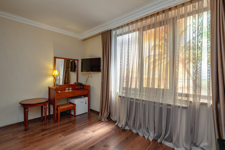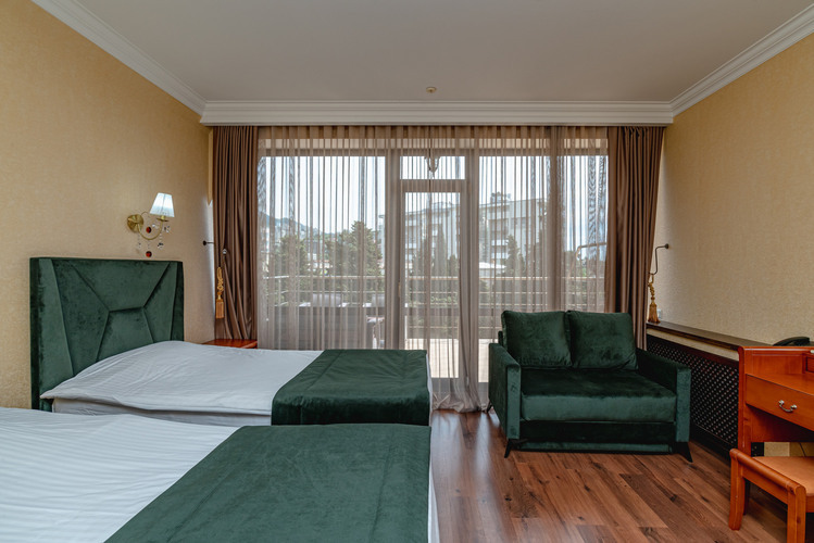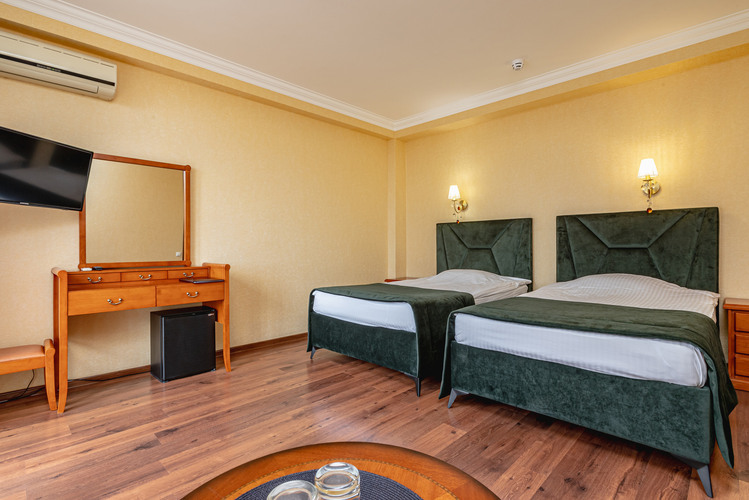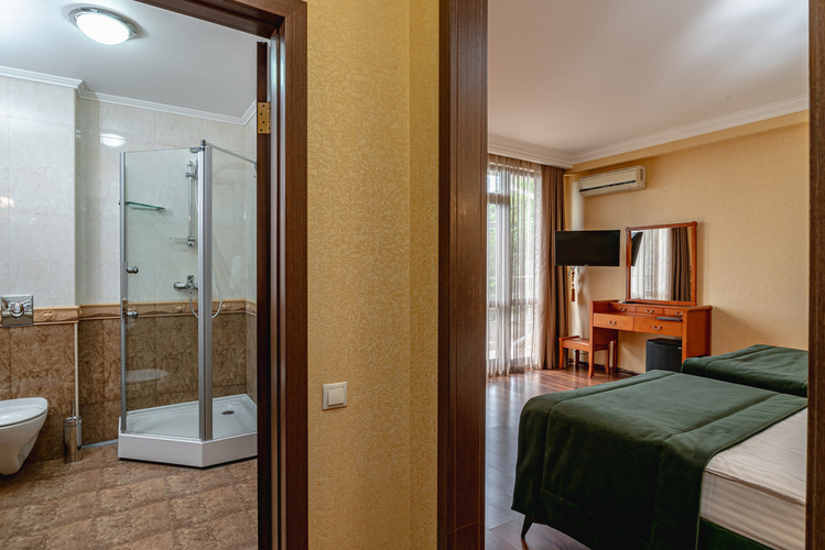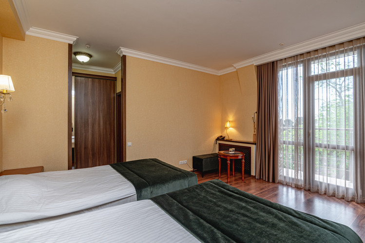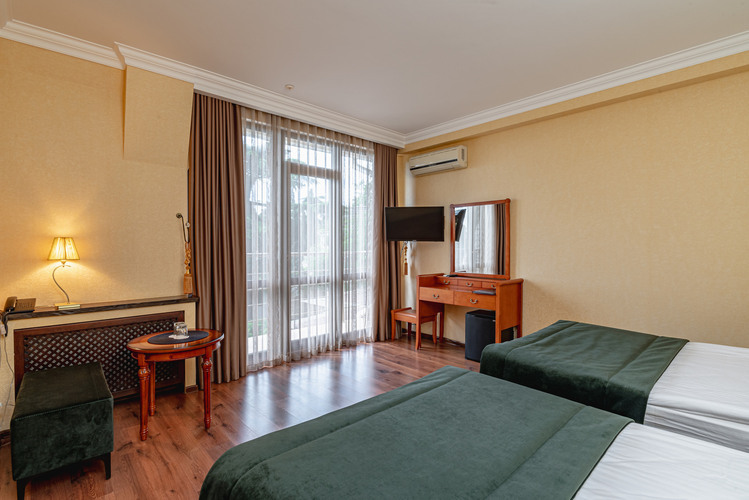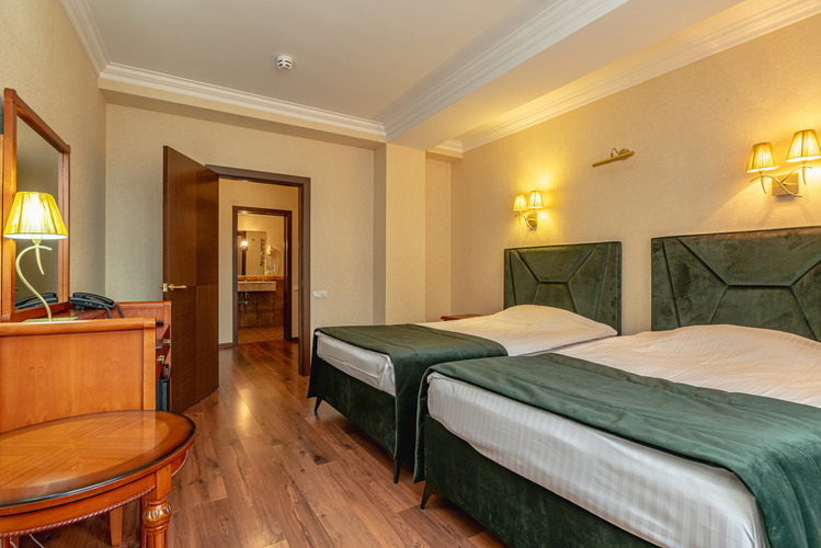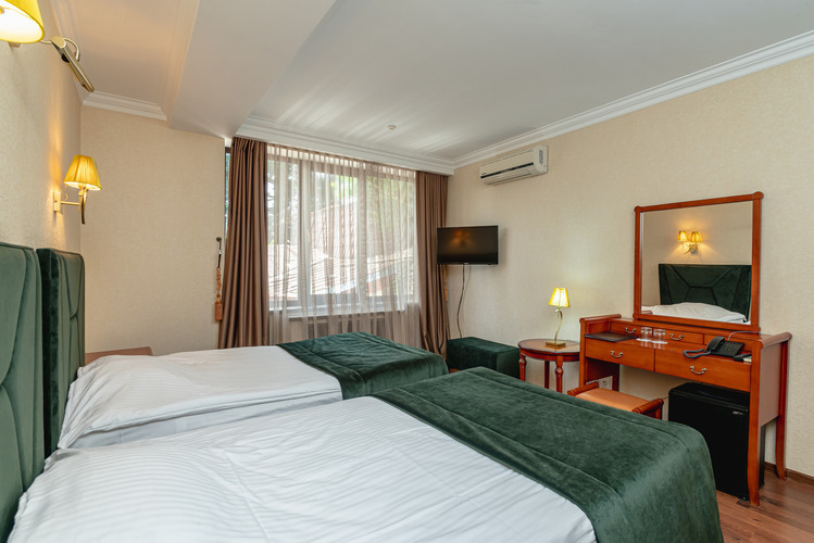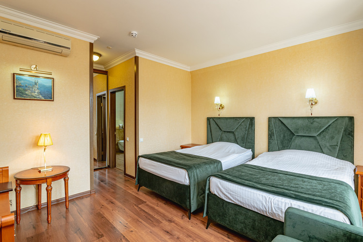 Комфортабельный однокомнатный номер общей площадью 28 квадратных метров с двумя полуторными (Twin) кроватями. Номер отеля в центре города Ялта оборудован мини-баром, сейфом, кондиционером, бесплатным WiFi, феном, телефоном, LED-телевизором с цифровым телевидением. Так же имеются: фирменные халаты, одноразовые тапочки, набор полотенец на каждого гостя, минипарфюмерия. Номер имеет выход на балкон.