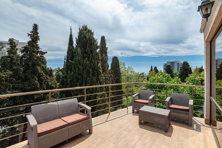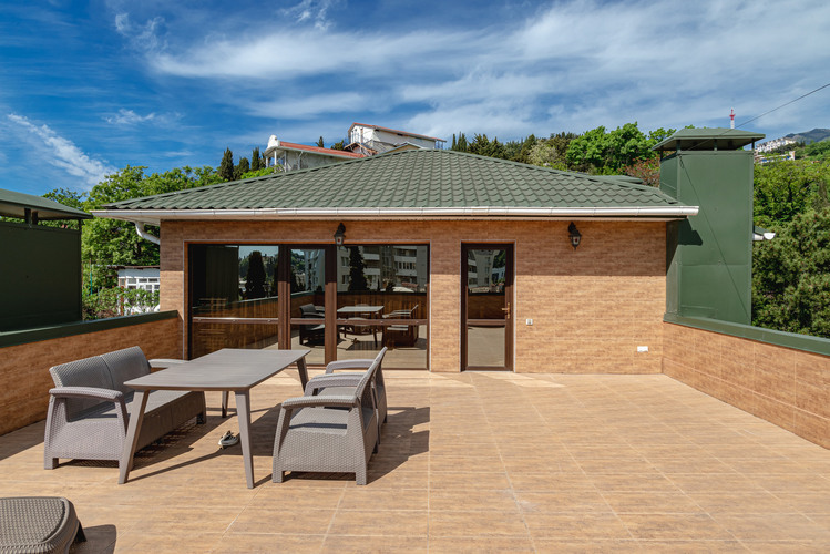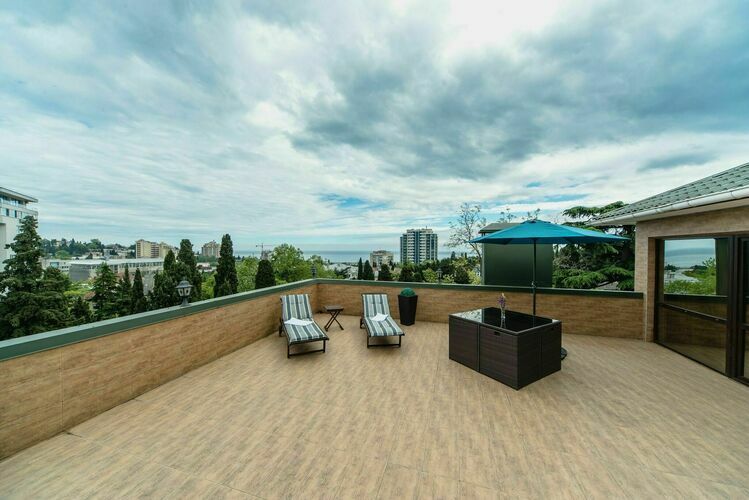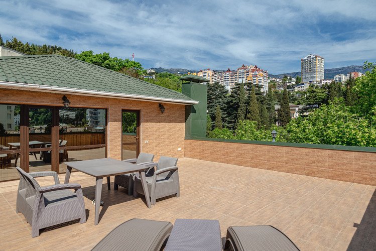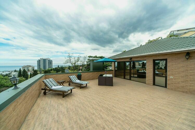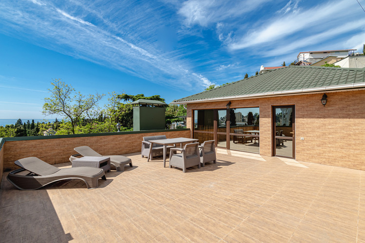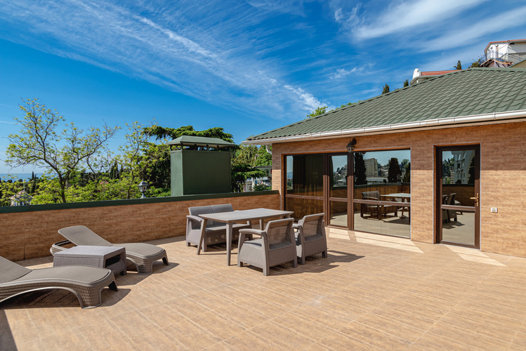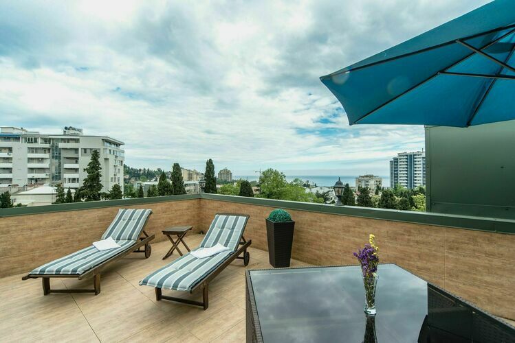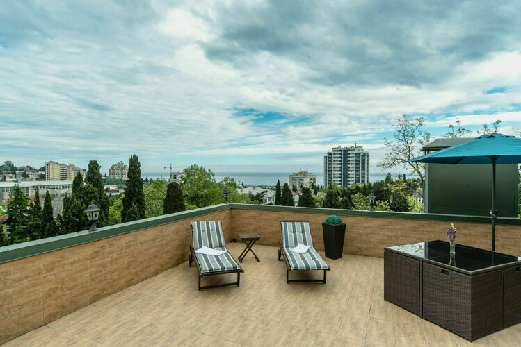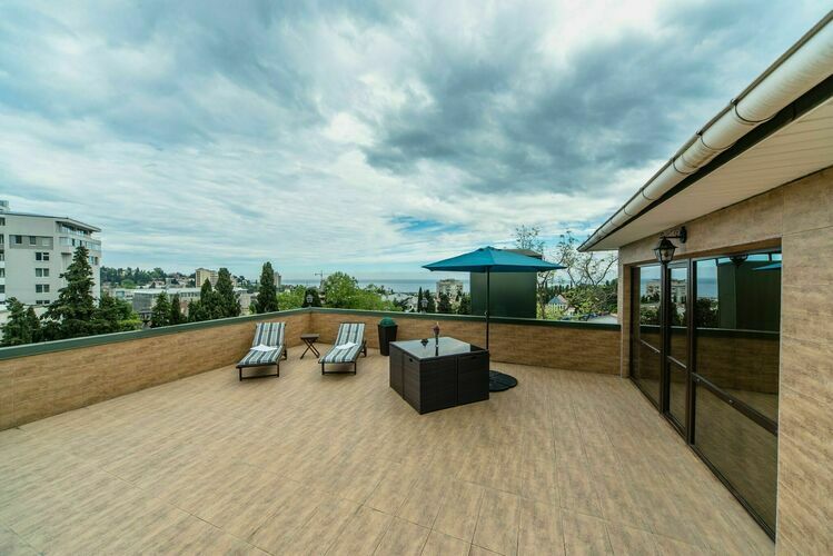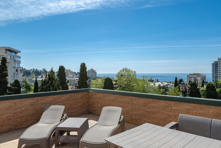 Роскошный просторный, хорошо освещенный двухкомнатный номер на последнем этаже, общей площадью 60 квадратных метров, с одной двуспальной кроватью и раскладным угловым двухместным диваном в гостиной. В номере частного отеля Ялты есть отдельная кухня, а также выход на террасу площадью 60 квадратных метров, оборудованную шезлонгами, ротанговыми креслами и столом для комфортного отдыха. В номере Вы можете воспользоваться мини-баром, сейфом, письменным столом, кондиционером, бесплатным Wi-Fi, феном,