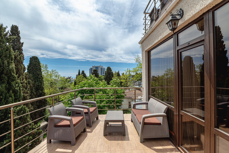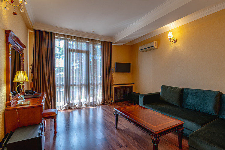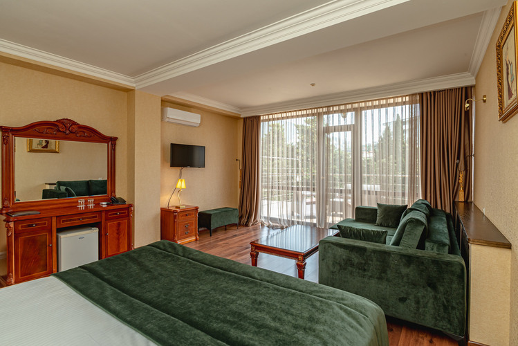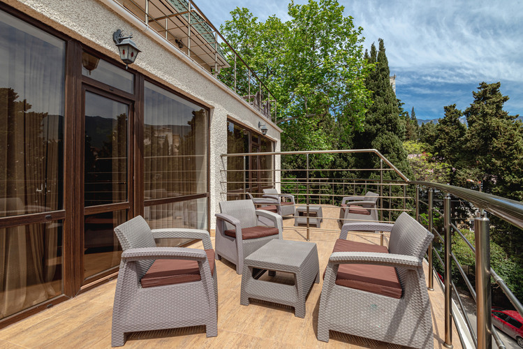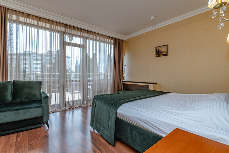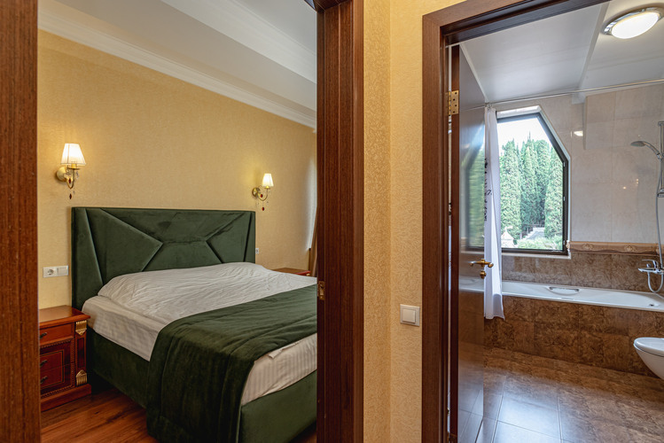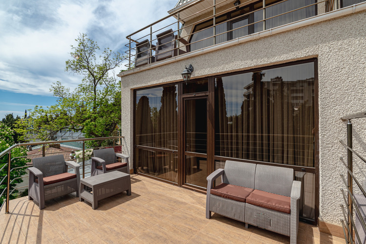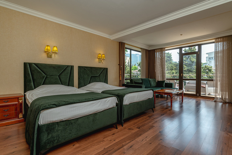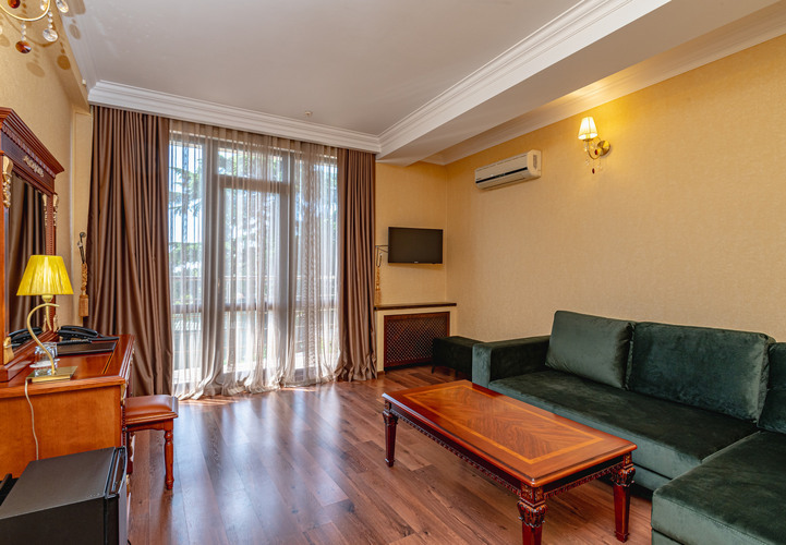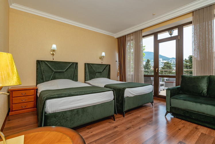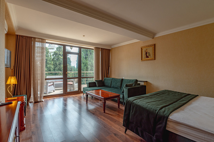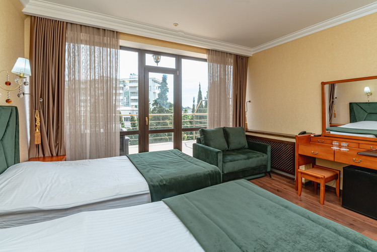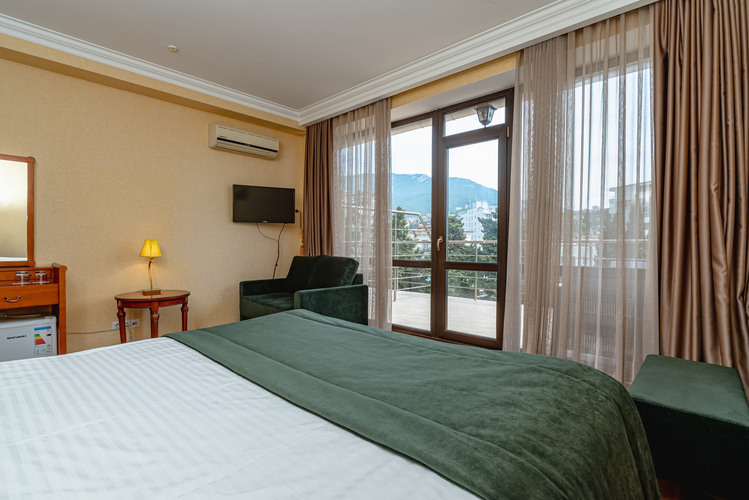 Просторный номер в частном отеле Ялты общей площадью 40 квадратных метров, с одной двуспальной или двумя полуторными (Twin) кроватями, также в гостиной зоне находится раскладной полуторный диван для проживания дополнительного человека. Есть выход на террасу площадью 15 квадратных метров, с мебелью из ротанга для комфортного отдыха. В номере имеется: мини-бар, сейф, кондиционер, Wi-Fi, фен, телефон, LED-телевизор с цифровым телевидением,также фирменные халаты, одноразовые тапочки