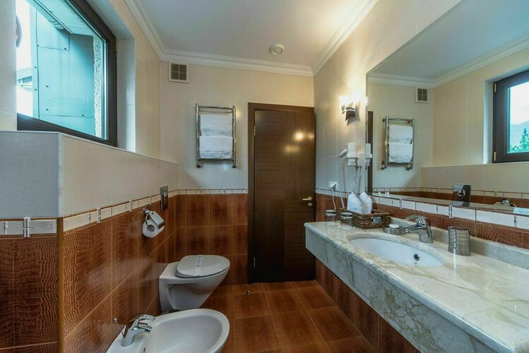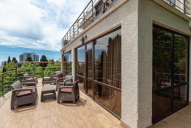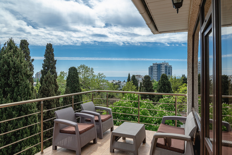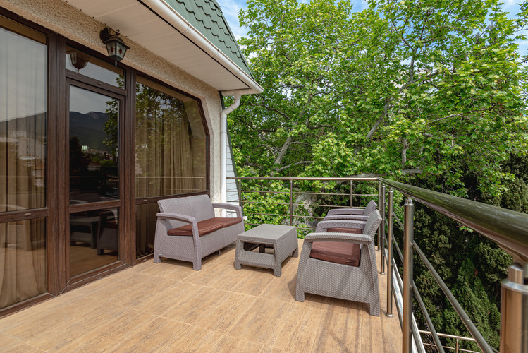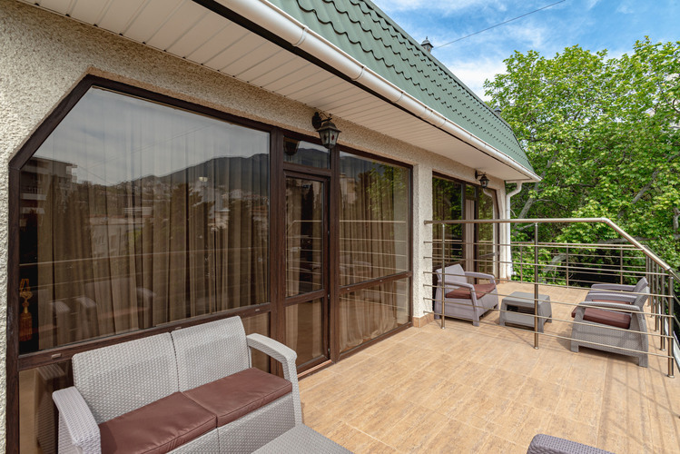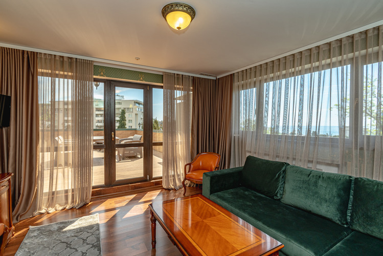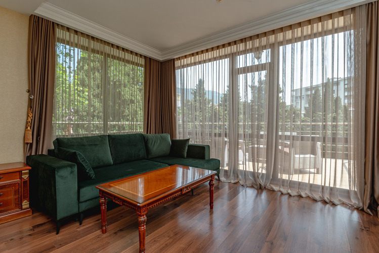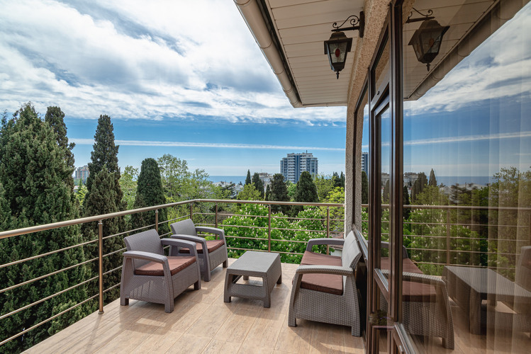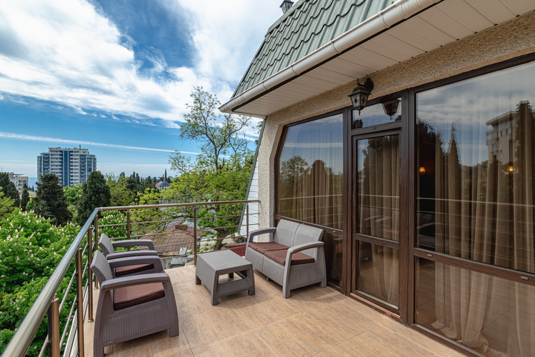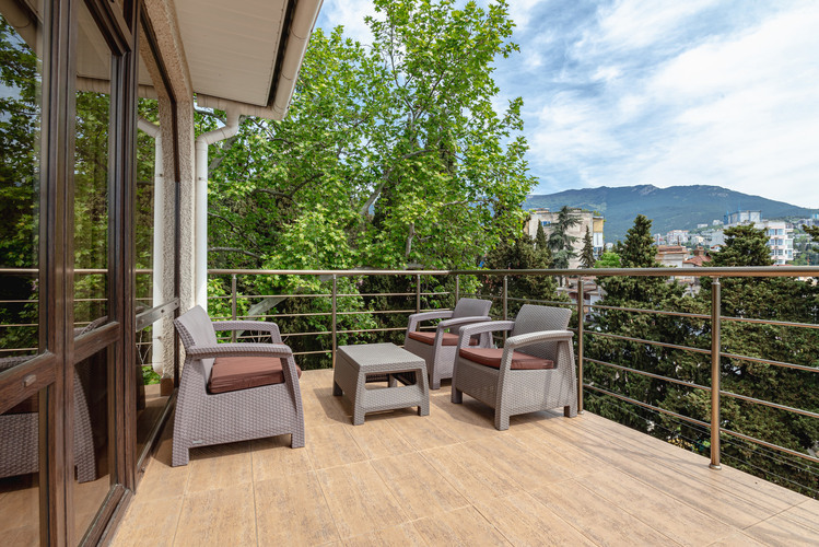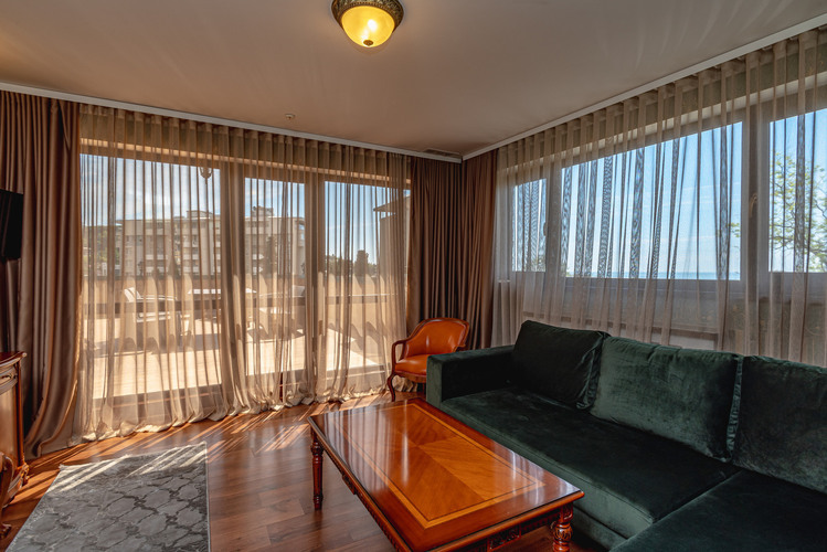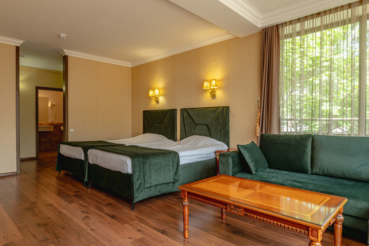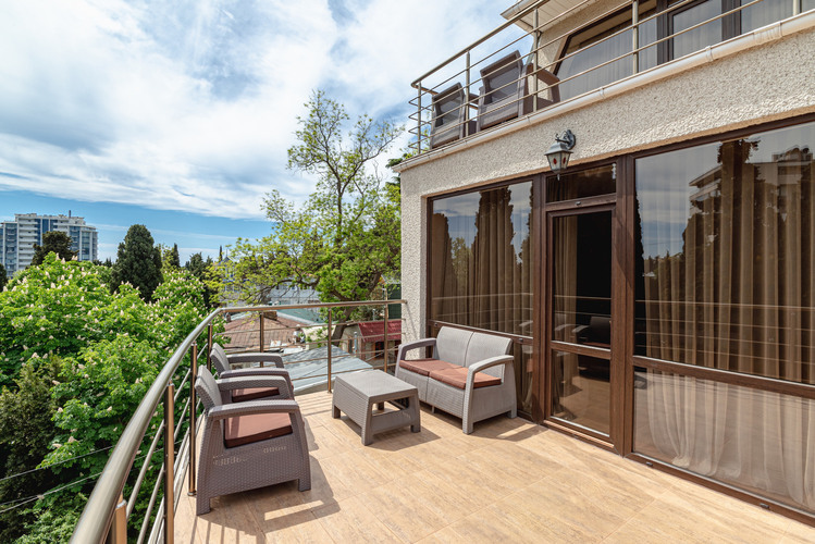 Просторный номер в частном отеле Ялты общей площадью 40 квадратных метров, с одной двуспальной или двумя полуторными (Twin) кроватями, также в гостиной зоне находится раскладной полуторный диван для проживания дополнительного человека. Есть выход на террасу площадью 15 квадратных метров, с мебелью из ротанга для комфортного отдыха. В номере имеется: мини-бар, сейф, кондиционер, Wi-Fi, фен, телефон, LED-телевизор с цифровым телевидением,также фирменные халаты, одноразовые тапочки