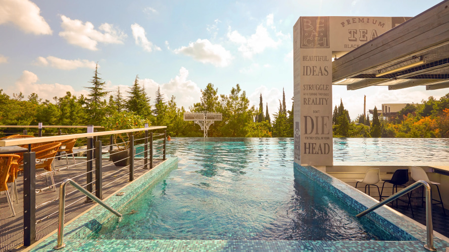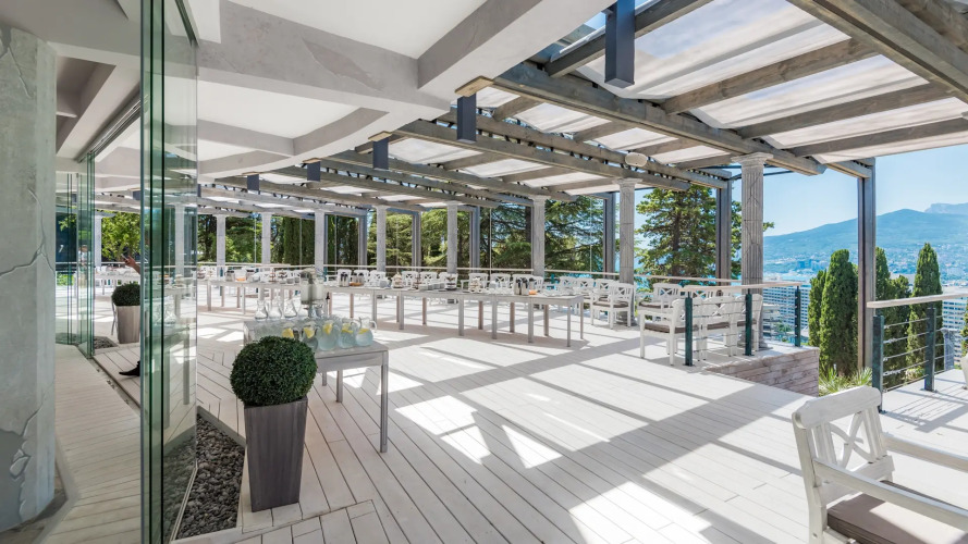 Современные спортивные площадки: футбол, волейбол, большой теннис, йога, настольный теннис. В отеле есть единственный в Крыму фитнес-зал с тренажерами Life-fitness, из окон которого открывается панорамный вид на море и горы.
