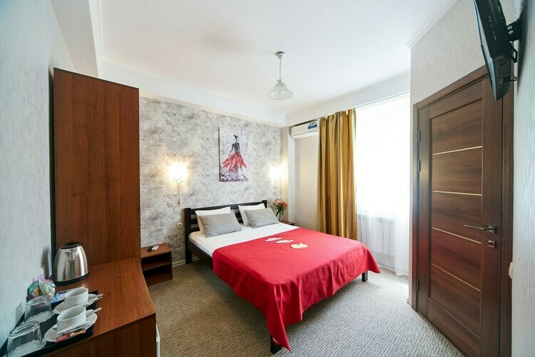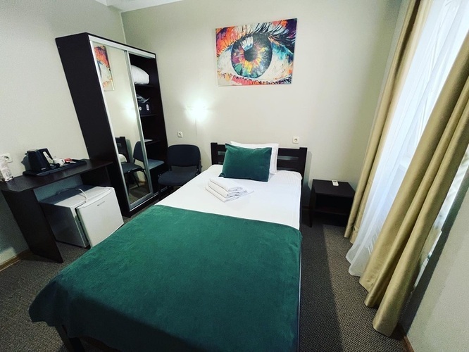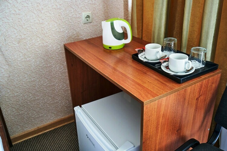 В номерах имеется вся необходимая мебель (кровать 2 м.*1,2м.), холодильник, кондиционер, телевизор (кабельное ТВ), фен, набор посуды, электрический чайник, чайный набор (чайные стики, чашки, блюдца и ложечки), сейф, щетка для одежды и обуви, лопатка для обуви. Санузел с душем, туалет, набор косметики (мыло, шампунь, гель для душа - пополняются каждый день при уборке номера).