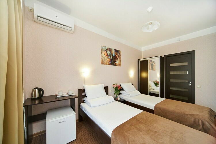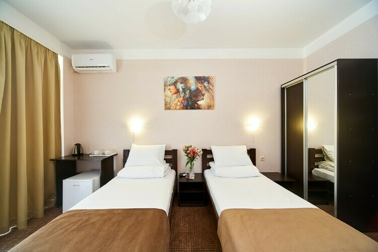 В номерах имеется вся необходимая мебель (две односпальные кровати - 2 м.*0,9 м., либо одна двухспальная кровать - 2 м.* 1,6 м.), холодильник, кондиционер, телевизор (кабельное ТВ), фен, набор посуды, электрический чайник, чайный набор (чайные стики, чашки, блюдца и ложечки), сейф, щетка для одежды и обуви, лопатка для обуви. Санузел с душем, туалет, набор косметики (мыло, шампунь, гель для душа - пополняются каждый день при уборке номера).