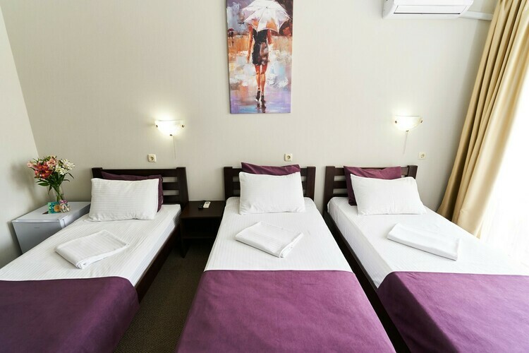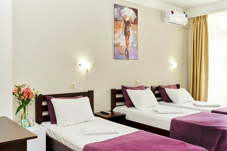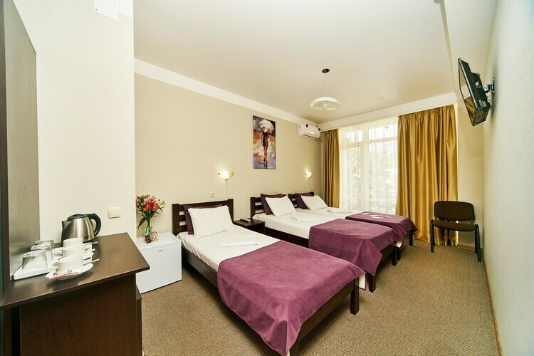 В номерах имеется вся необходимая мебель (три односпальные кровати - 2 м.*0,9 м., либо одна двухспальная кровать - 2 м.* 1,6 м. и одна односпальная 2 м.*0,9 м.), холодильник, кондиционер, телевизор (кабельное ТВ), фен, набор посуды, электрический чайник, чайный набор (чайные стики, чашки, блюдца и ложечки), сейф, щетка для одежды и обуви, лопатка для обуви. Санузел с душем, туалет, набор косметики (мыло, шампунь, гель для душа - пополняются каждый день при уборке номера).